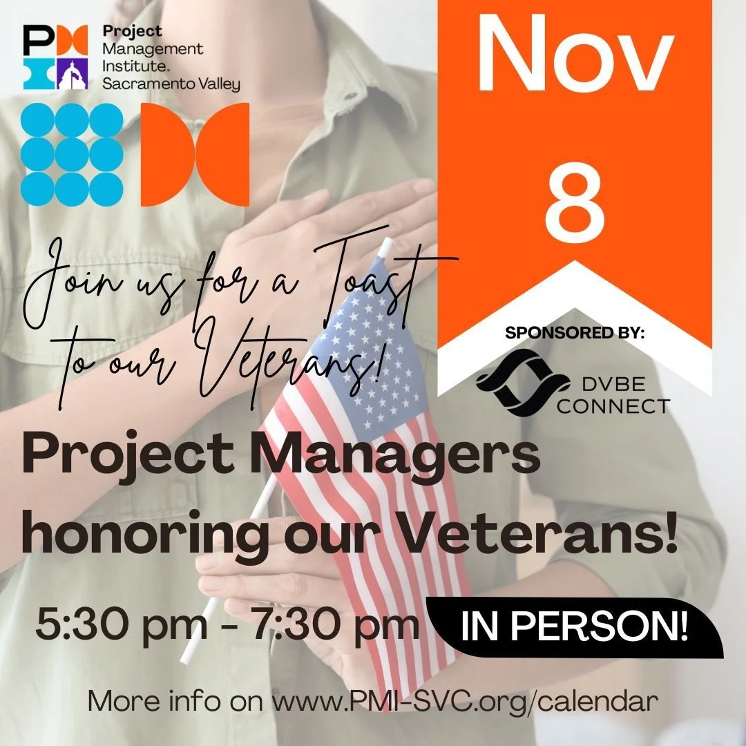 Join us Friday, November 8th, 2024 for a special event honoring our Veterans! Connect with project management professionals, Veterans, recruiters, and hiring managers who want to make a difference in the lives of Veterans. Expand your network, ask questions about project management as a profession, and join us in a toast to honor Veterans!